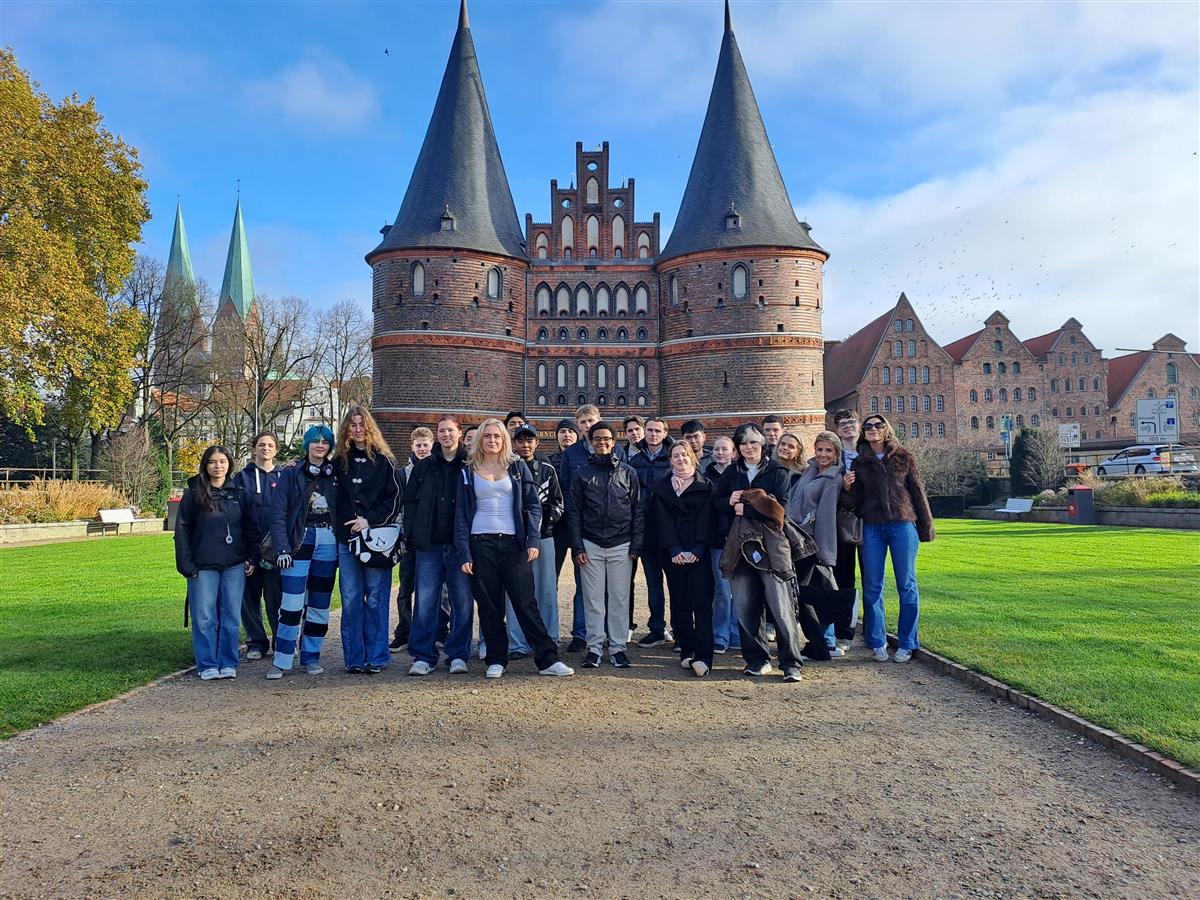 Tysk-elevene (vg3) foran den middelalderske "Holstentor"-porten i Lübeck.Vår nylige utveksling gikk til Nord-Tyskland og vi kom tilbake rikere på kulturell forståelse, språkkunnskaper, vennskap og ja – vi oppdaget også gleden ved å utforske til fots: Turens uoffisielle motto var «Det er bare 5 minutter å gå!».